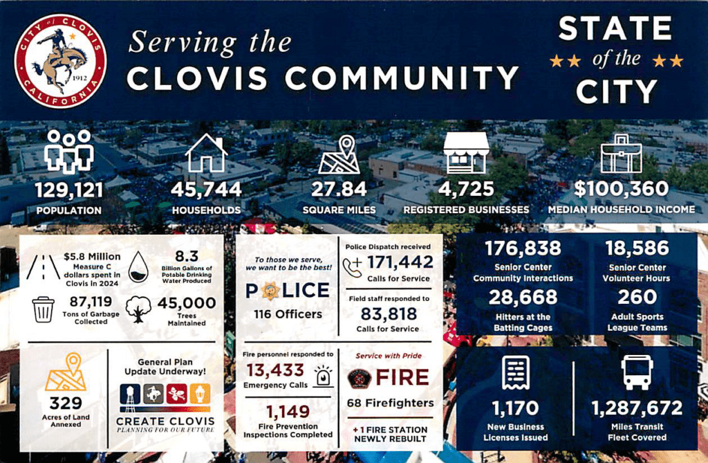 Clovis is a community that supports families through excellent educational opportunities, responsive public safety services, clean streets and parks, and planned community growth to bring balance to the local economy and its residents.